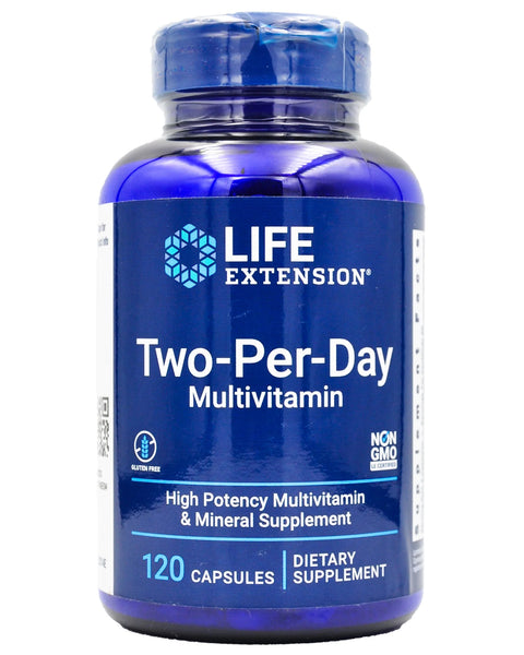Life Extension Two-Per-Day contains bioactive folate as L-5-methyltetrahydrofolate calcium salt and B12 as methylcobalamin. It also includes zinc citrate, mixed tocopherols as vitamin E, chromium as Crominex®, and a range of patented antioxidants. Gluten free, non-GMO.