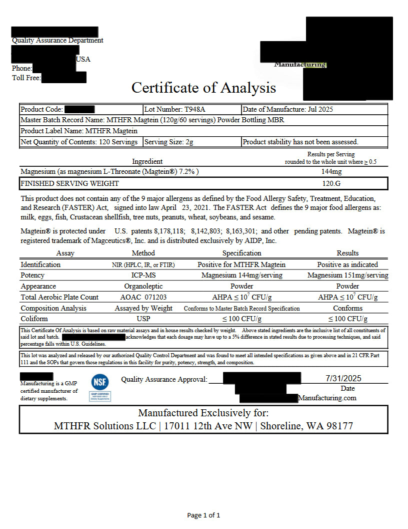 | Elemental Magnesium (from 2,000 mg of Magnesium L-Threonate as Magtein®) | 144 mg | 34% (Total) |